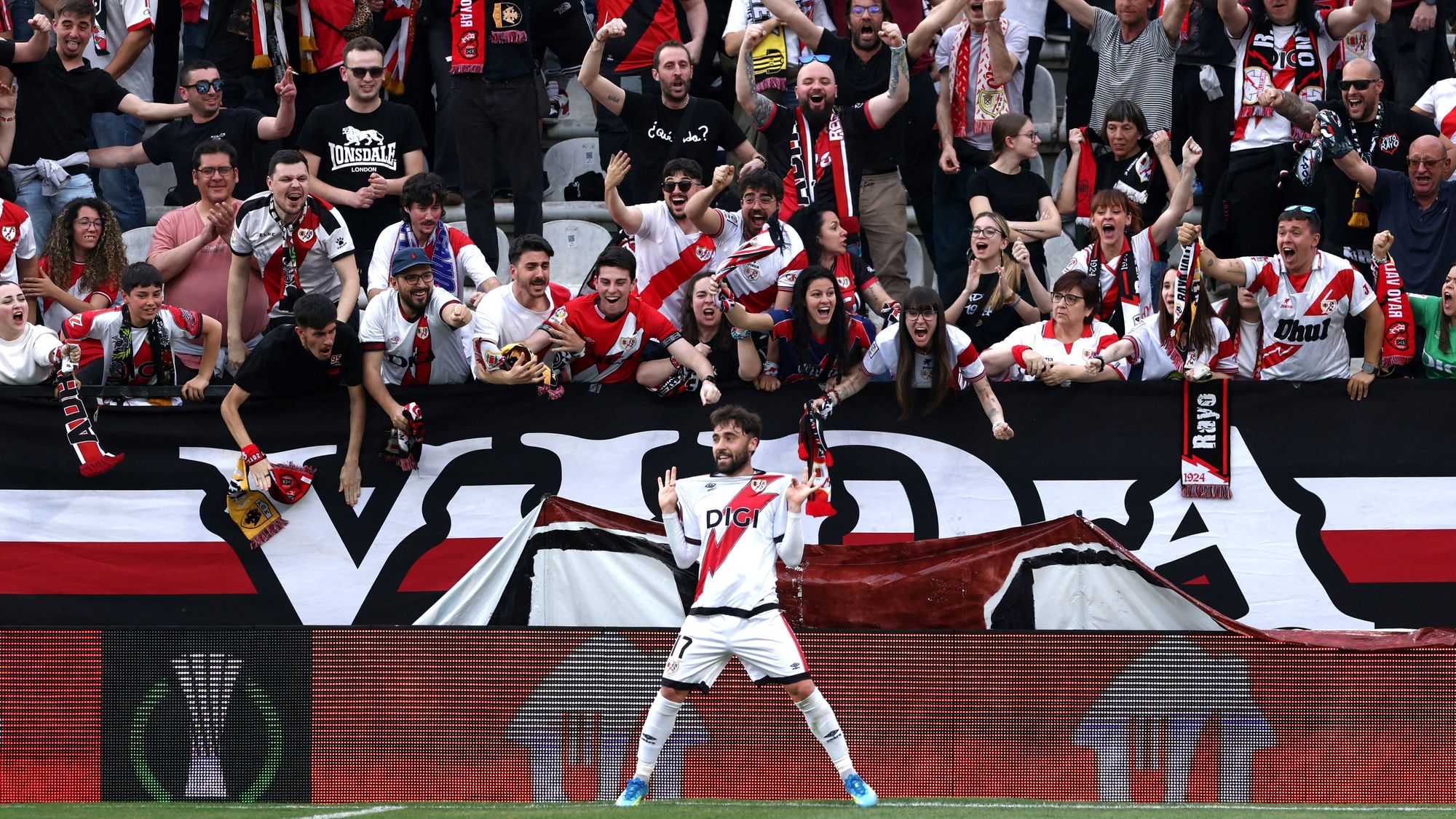 La afición del Rayo recibió al equipo con bufandas al viento, cánticos atronadores, aplausos y varios tifos en diferentes localizaciones del estadio. Se preveía una tarde especial y así fue, aunque la primera alegría llegó a los dos minutos, seguramente mucho antes de lo que la gente esperaba.
