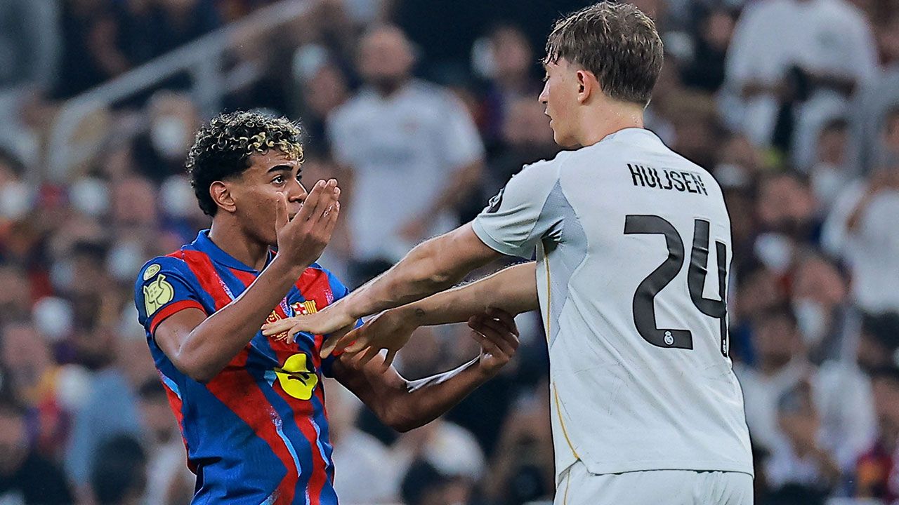 En El Clásico no hay amistades. Por el contrario, las buenas relaciones pueden romperse en este tipo de partidos de pulsaciones tan elevadas. Así sucedió con Lamine Yamal y Dean Huijsen, compañeros en la Selección Española, quienes intercambiaron empujones durante la recta final del partido cuando el defensa central se interpuso en el camino de Lamine Yamal.